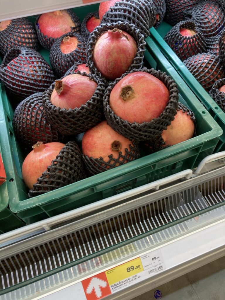 タイのザクロはだいたいkg/90バーツぐらい、個体にもよりますが少し小さめのものなら50バーツ/1個ぐらいでも買えると思います。