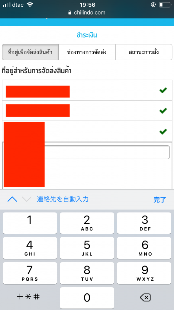 画像では赤く塗りつぶしていますが、上から「名前」「苗字」「郵便番号」「県」...という順番で情報を入力していきます。確かタイでの電話番号の入力もこの段階でしたと思います。