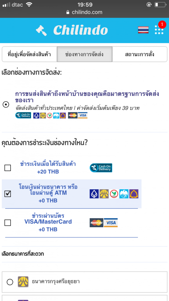 「代引きサービス」も選べるようですが+20バーツの手数料が掛かります。「銀行振込」と「クレジットカード」での支払いは手数料が掛からないようです。