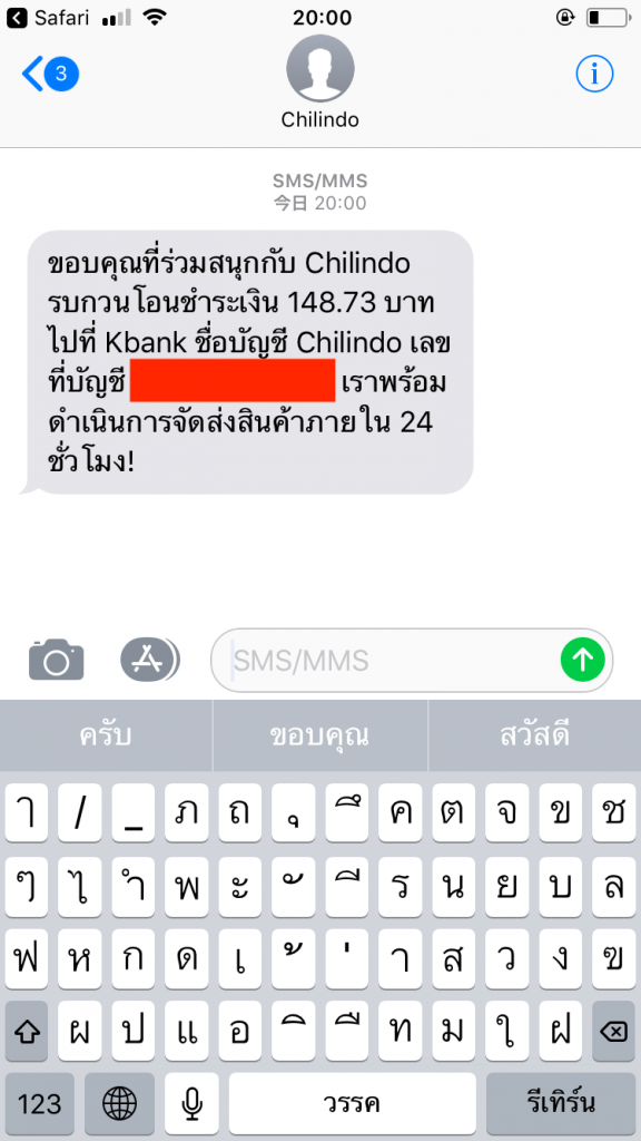 見事に商品を落札すると以下のような表示がされます。ちなみに私は上記の商品を「110バーツ:約350円」で落札しました。