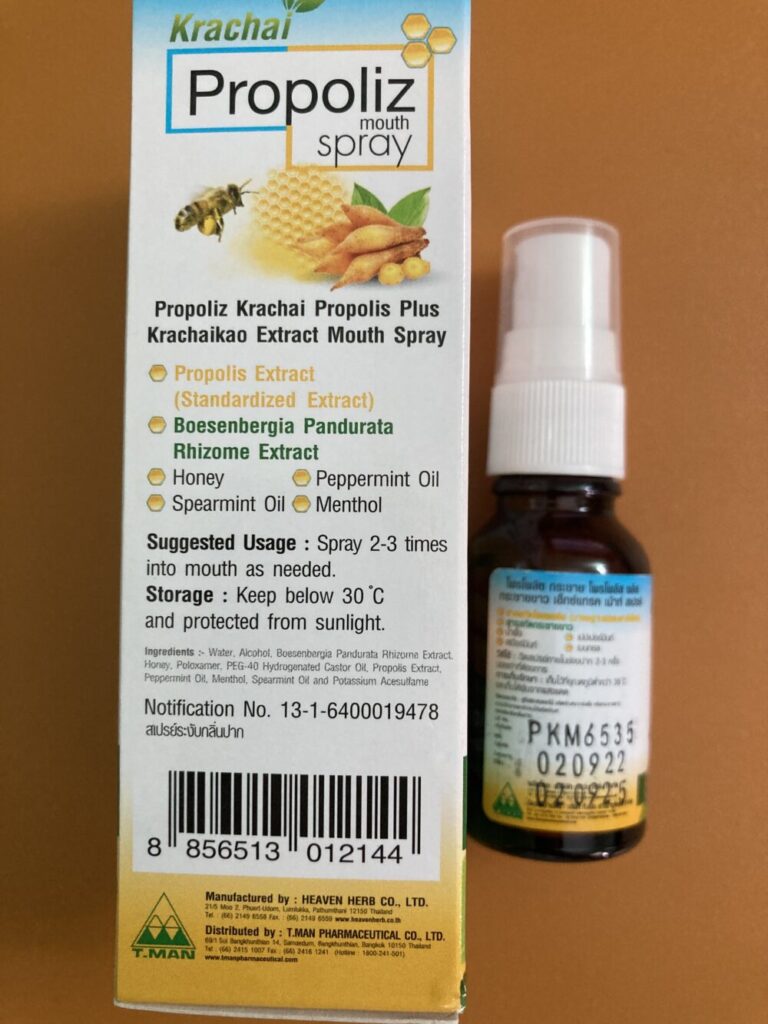 「プロポリス スプレー」と言っても伝わるかもしれませんが、タイと日本では英語の発音が結構違いますので、この記事にある画像を見せた方が早いかもしれません。