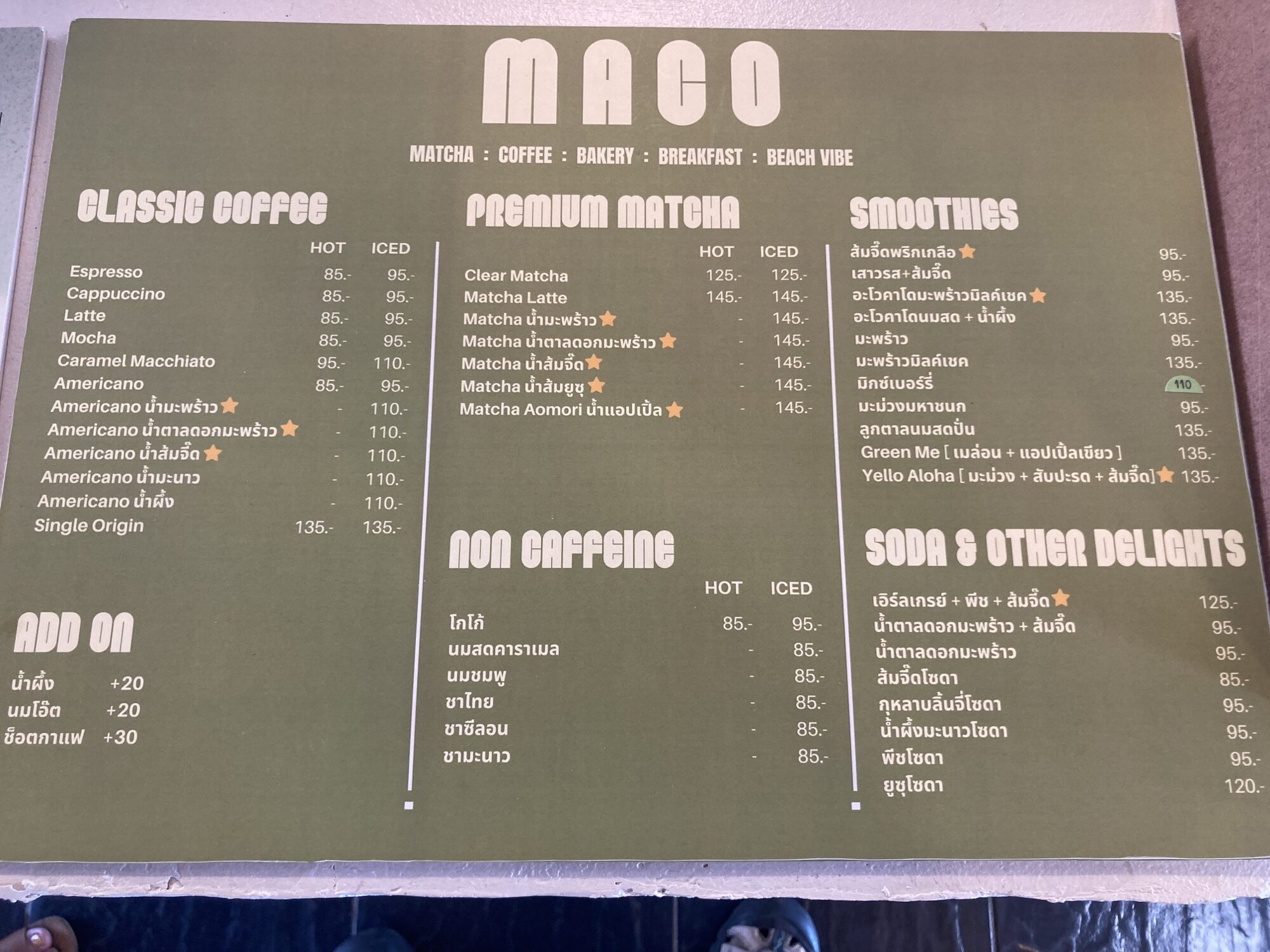 - エスプレッソ / カプチーノ / ラテ / モカ:ホット85฿・アイス95฿